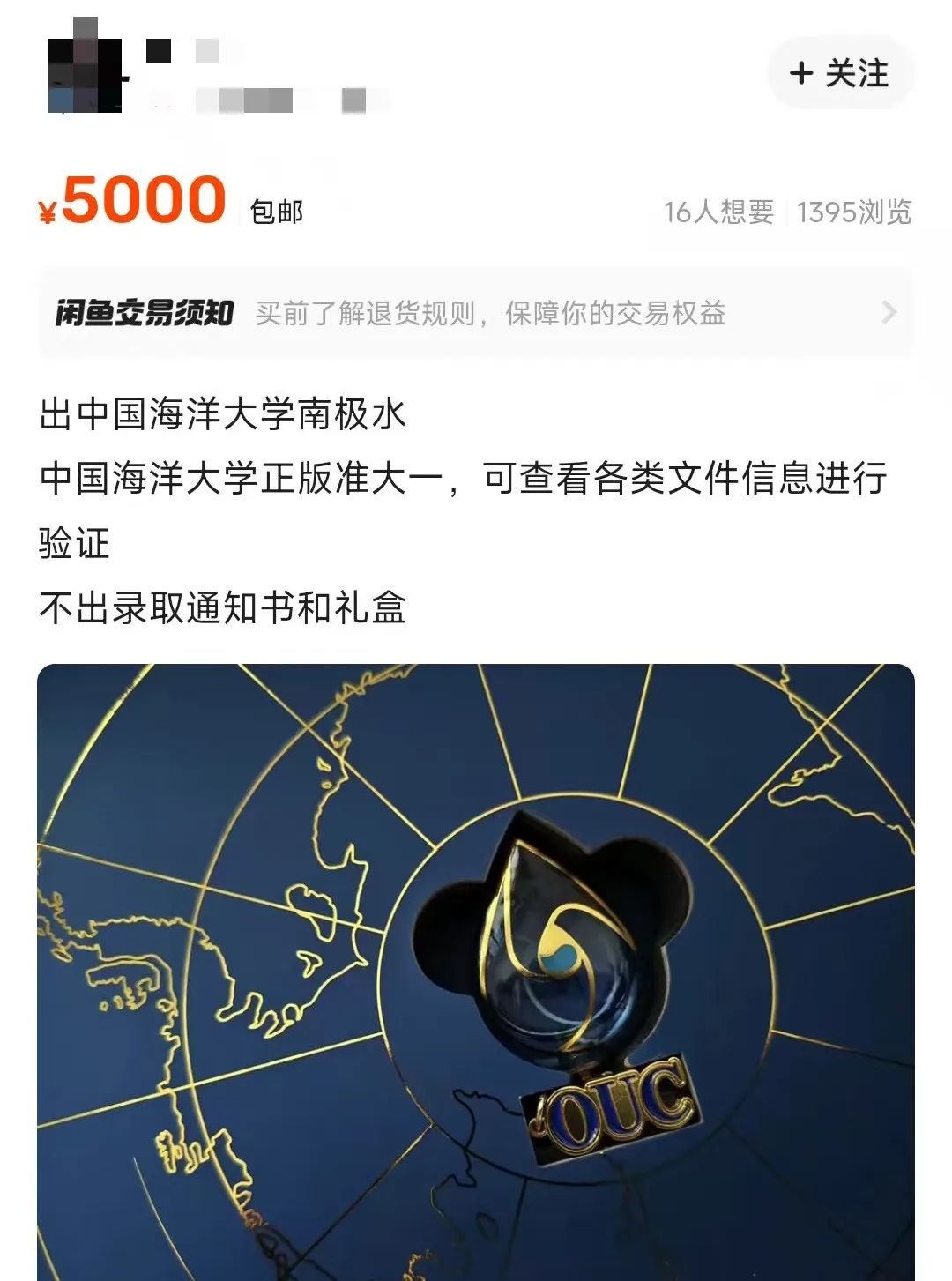 “我们这个是不对外公开出售的!”8月7日,上游新闻记者致电中国海洋大学本科招生办公室了解此事,一名工作人员表示,这个南极海水吊坠,中国海大官方是不出售的,至于二手平台的售卖行为,也非官方售卖。该工作人员强调,骗子可能制假售假,所以要注意识别,不建议高价购买。“我们能提醒的就是,网上很多可能是假的,要注意,不要被骗了。”