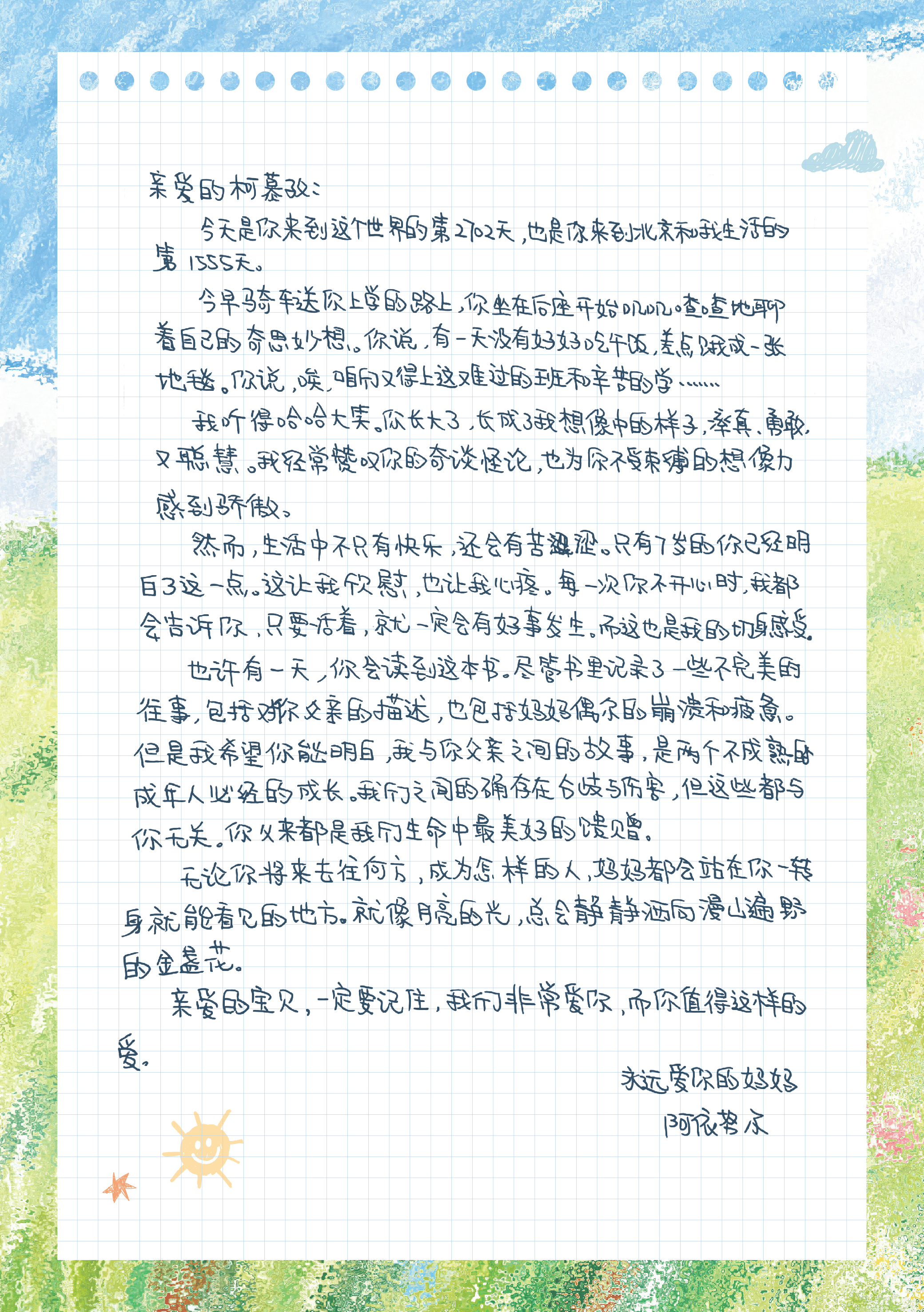 阿依努尔透露说,这是在两位编辑的建议下写的,“让一个内敛的中国女性,写这么一封敞开心扉的信,还是挺难的。但我非常感谢她们,帮助我说出了心里话。女儿还没有看过,我想等她长大一些再给她看。”
